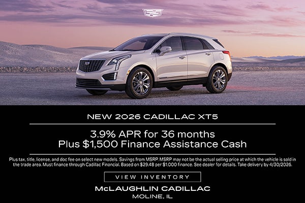 Get a new 2026 Cadillac XT5 with 3.9% APR for 36 months plus $1,500 Finance Assistance Cash.