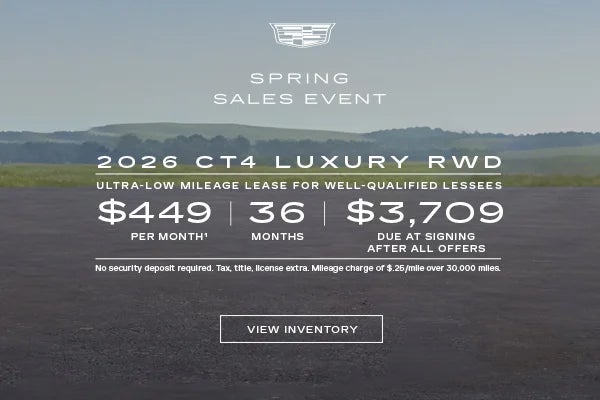 Lease a new 2026 Cadillac CT4 Luxury RWD for $449 per month for 36 months with $3,709 due at signing after all offers with an ultra-low mileage lease for well-qualified buyers.