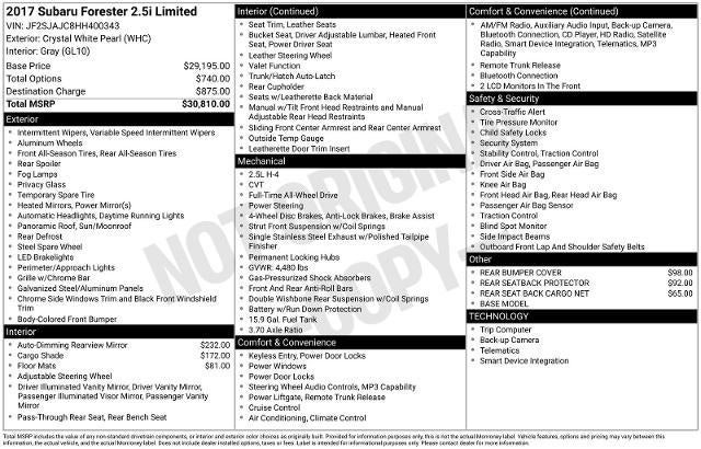2017 Subaru Forester 2.5i Limited Crystal White Pearl AWD Lineartronic CVT 2.5L 4-Cylinder DOHC 16V VVT